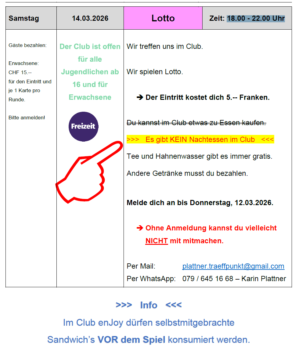 Du bekommst eine Sprachnachricht mit den Öffnungszeiten und dem Programm für den «Treffpunkt für alle – Club enJoy»